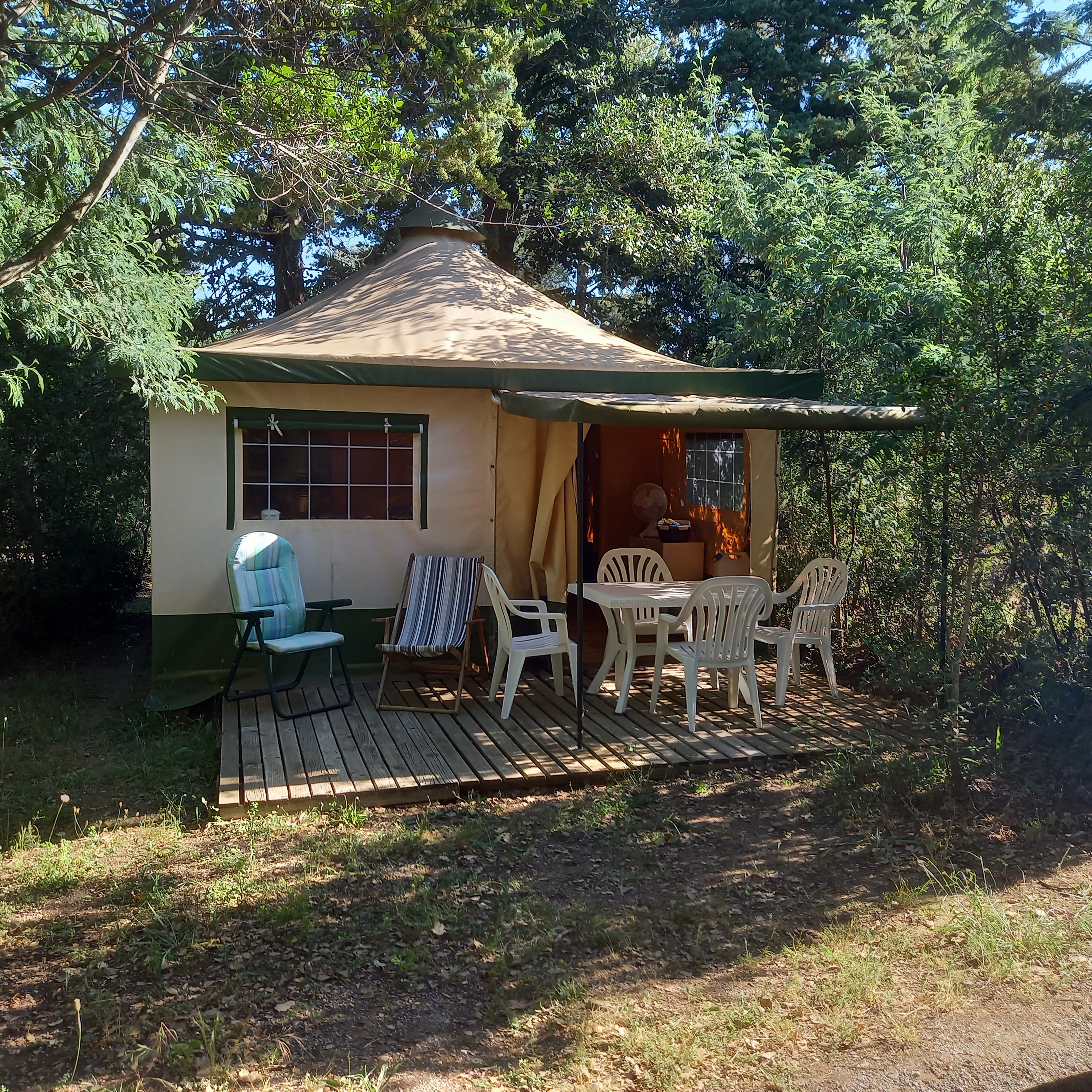 Elles sont composées de 2 chambres, d’un espace à vivre avec coin cuisine (sans eau courante) et d’une grande terrasse. Vous n'avez pas de sanitaire privatif. Ceux du camping sont à votre disposition.